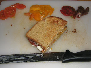 I am well aware that I am not the creator or even likely the first person to impart this knowledge, but since someone (likely a hacker trying to give me a virus) from Bangladesh is showing up on my visitor map I thought maybe it was appropriate to share, and even possible that some may not know about this sandwich. If you are an old friend of the tomato sandwich or a newcomer I highly recommend you go to the nearest farmer's market or into your garden to try this little baby ASAP.